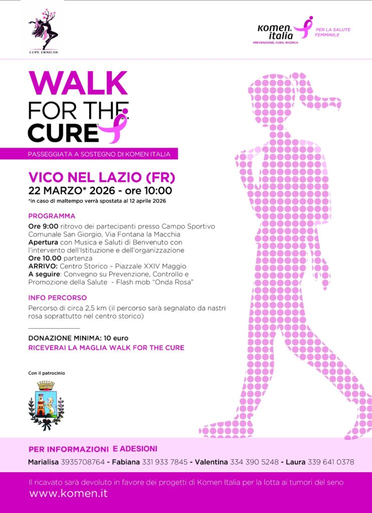 Sarà Vico nel Lazio ad aprire le danze, domenica 22 marzo 2026, con la prima Walk for the Cure della provincia di Frosinone. Una mattinata all’insegna della prevenzione, della solidarietà e del movimento collettivo, promossa dalle Lupe Erniche e sostenuta dall’Amministrazione Comunale, che ha abbracciato con convinzione l’iniziativa invitando tutta la comunità a scendere in strada — o meglio, a camminare insieme — per una causa che riguarda tutti.