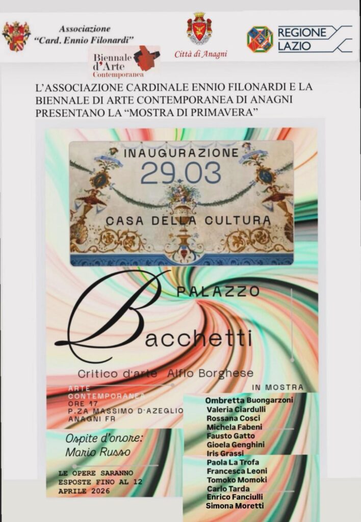 L’iniziativa è promossa dall’Associazione “Card. Ennio Filonardi” in collaborazione con la Biennale di Arte Contemporanea di Anagni, realtà che negli ultimi anni stanno contribuendo a consolidare un percorso artistico sempre più strutturato e riconoscibile nel territorio.