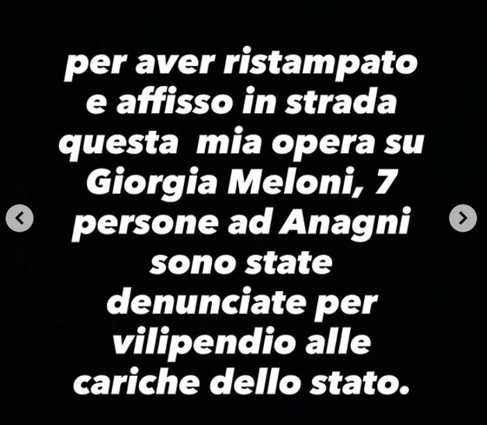 Sette persone denunciate per vilipendio alle cariche dello Stato per aver affisso sui muri di Anagni un’opera d’arte. È quanto accaduto il 3 aprile 2026, quando i Carabinieri della Compagnia di Anagni, al termine di un’attività d’indagine, hanno notificato le denunce a sette attivisti dopo la querela depositata dal vicesindaco della città Riccardo Ambrosetti.