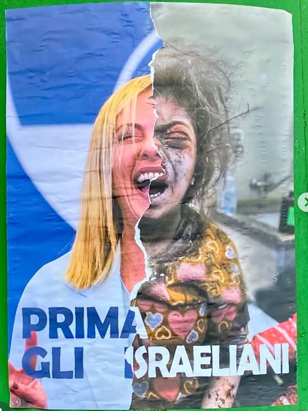 Prima di strappare, si legge la scritta “Prima gli italiani”, slogan della coalizione di governo. Dopo lo strappo, la frase si trasforma in “Prima gli israeliani”. Un cortocircuito visivo e semantico che, nelle intenzioni dell’autore, intende denunciare la posizione italiana sul conflitto in corso a Gaza.