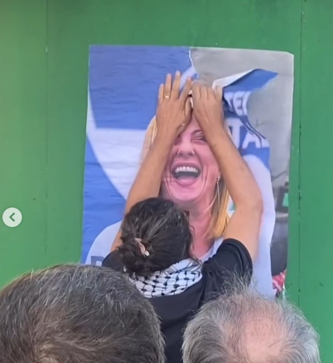 Al centro della vicenda c’è un’opera dell’artista napoletano Edoardo Castaldo, che da tempo utilizza il linguaggio visivo per fare critica politica. L’immagine accosta il volto della presidente del Consiglio Giorgia Meloni a quello di una donna palestinese ferita, immortalata dal fotoreporter Ahmad Hasaballah. Ma il meccanismo concettuale dell’opera si innesca solo con un gesto fisico: lo strappo della carta.