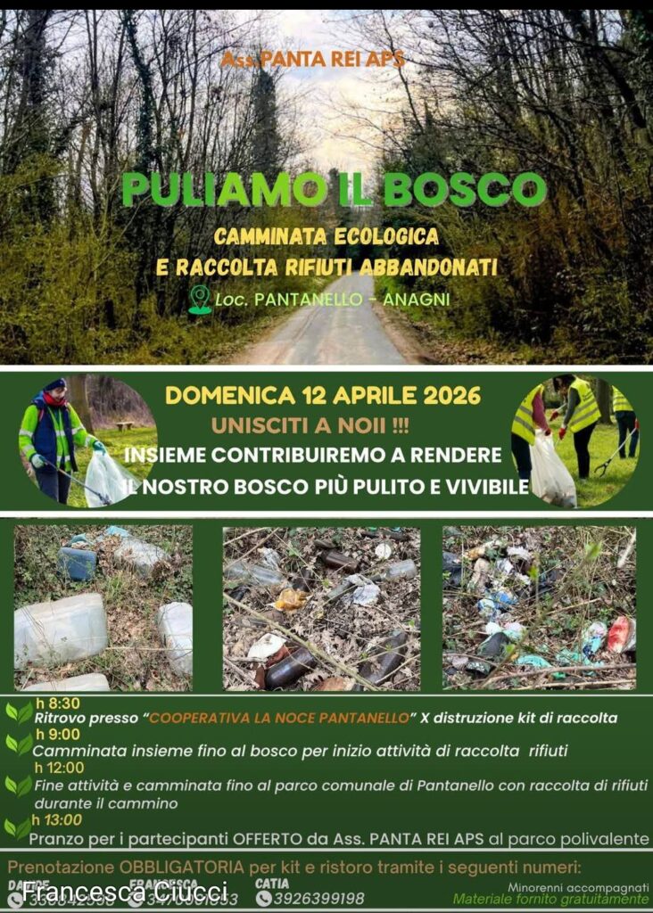 Arriva la primavera e con essa un invito che sa di impegno civico e amore per il territorio. Domenica 12 aprile 2026, la località Pantanello, nel Comune di Anagni, diventerà il palcoscenico di una bella iniziativa di volontariato ambientale: “Puliamo il Bosco”, la camminata ecologica con raccolta di rifiuti abbandonati organizzata dall’associazione Panta Rei APS. Un appuntamento aperto a tutti, famiglie comprese, per rimettere le mani — letteralmente — su un angolo di natura che merita rispetto e cura. L’evento è realizzato in collaborazione con il Comune di Anagni e in particoalre con il consigliere di zona Donatello Cardinali e con il consigliere comunale con delega ai rifiuti RIccardo Natalia.