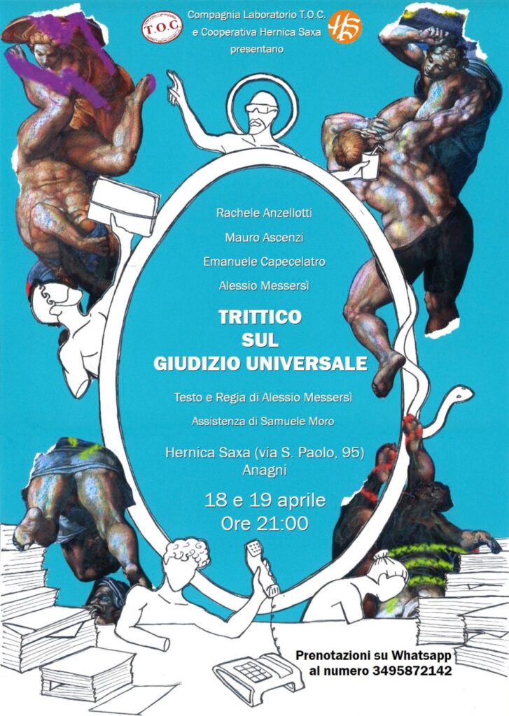 E se il Giorno del Giudizio finisse intasato tra scartoffie, impiegati annoiati e anime con le giuste conoscenze? È questa la domanda — provocatoria e irresistibilmente comica — al centro di Trittico sul Giudizio Universale, lo spettacolo che andrà in scena sabato 18 e domenica 19 aprile, alle ore 21.00, presso l’Hernica Saxa di Anagni.