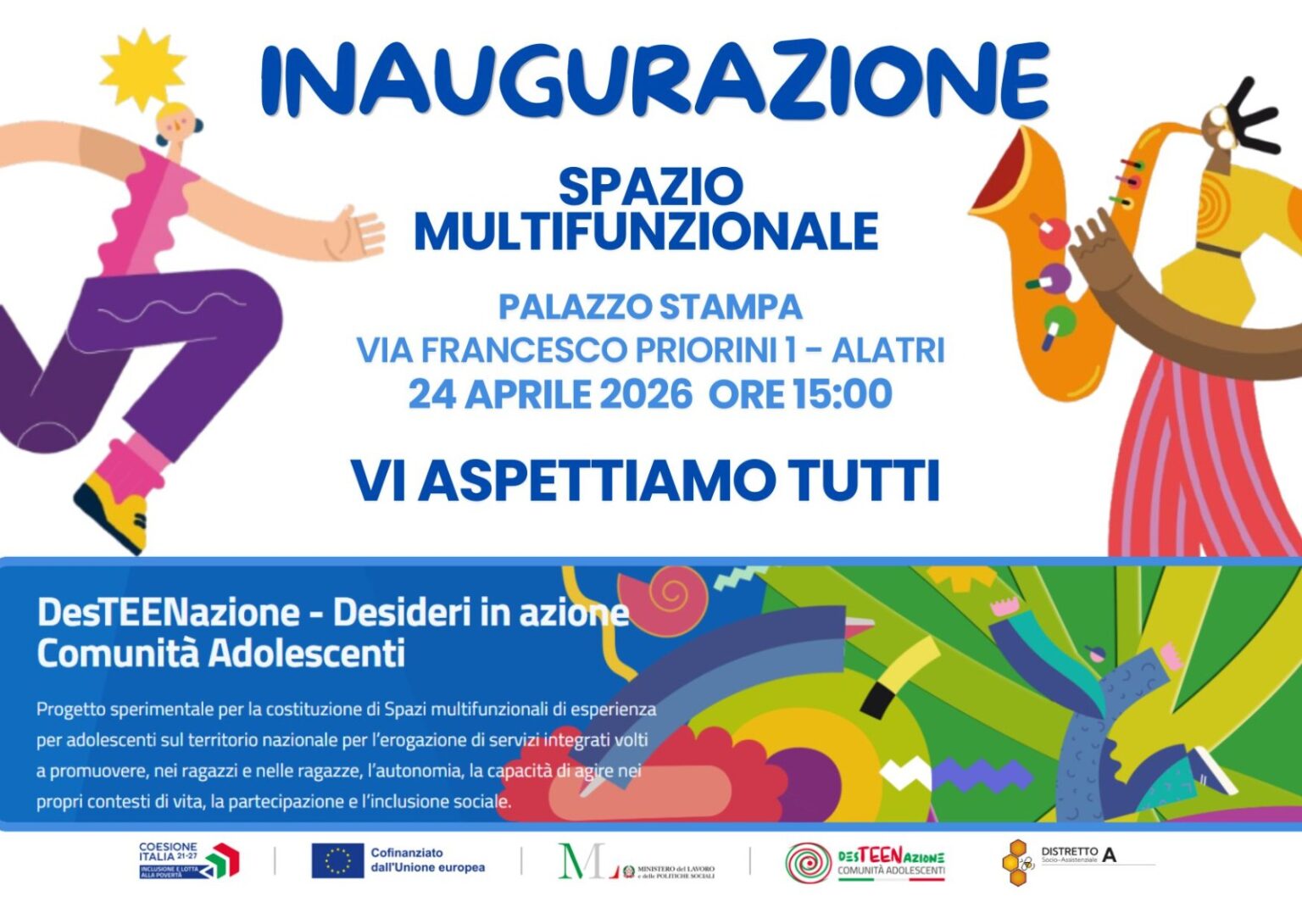 Nel cuore del centro storico di Alatri, a Palazzo Stampa nel centro storico di Alatri, prende forma un nuovo spazio pensato per le nuove generazioni. È qui che il prossimo 24 aprile 2026, alle ore 15:00, verrà inaugurato lo Spazio Multifunzionale per adolescenti realizzato nell’ambito del progetto DesTEENazione – Desideri in azione – Comunità Adolescenti, promosso dal Distretto Socio-Assistenziale FR A con il Comune di Alatri in qualità di ente capofila.