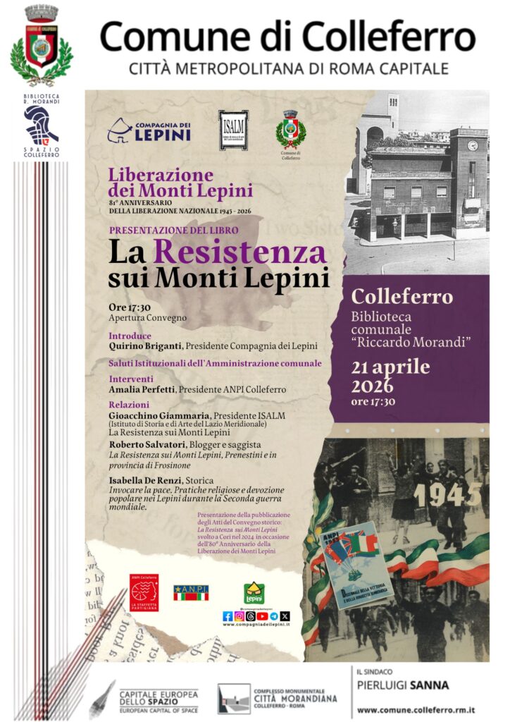 Nel giorno in cui l’Italia si prepara a celebrare l’81° anniversario della Liberazione, il territorio del Lazio si conferma ancora una volta luogo vivo di memoria, studio e riflessione storica. In questo contesto si inserisce l’iniziativa promossa dall’Istituto di storia e di arte del Lazio meridionale di Anagni (ISALM), che martedì 21 aprile alle ore 17.30 porterà a Colleferro la presentazione del volume “La Resistenza sui Monti Lepini”.