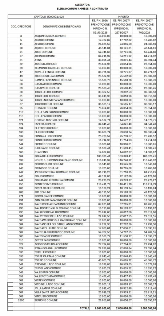 Tra i Comuni del territorio ciociaro e pontino che riceveranno il contributo più elevato spiccano Pontecorvo (€ 118.411,79 annui), Monte San Giovanni Campano (€ 116.248,92), Isola del Liri (€ 103.320,41) e Fiuggi (€ 99.630,74). Importi più contenuti, ma non per questo meno significativi per le casse locali, vanno invece ai piccoli borghi come Acquafondata, Belmonte Castello, Casalattico, Settefrati e Viticuso, ciascuno dei quali riceverà il contributo minimo fissato a € 10.000,00 annui.