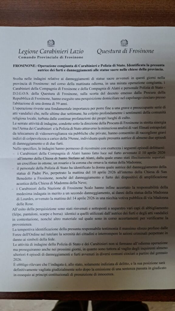 – il personale della Polizia di Stato ha identificato la donna quale autrice del danneggiamento della statua di Padre Pio, perpetrato la mattina del 10 aprile 2026 all’interno della Chiesa di San Benedetto a Frosinone, nonché del danneggiamento e furto dei dispositivi di amplificazione acustica della Chiesa di Madonna della Neve;