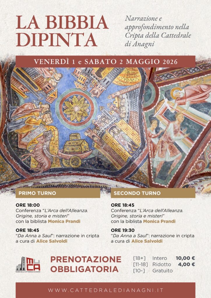 “La Bibbia Dipinta” si propone così come un’occasione preziosa per riscoprire la ricchezza del patrimonio artistico custodito ad Anagni, offrendo una modalità di fruizione nuova, in cui la dimensione divulgativa si intreccia con quella evocativa.