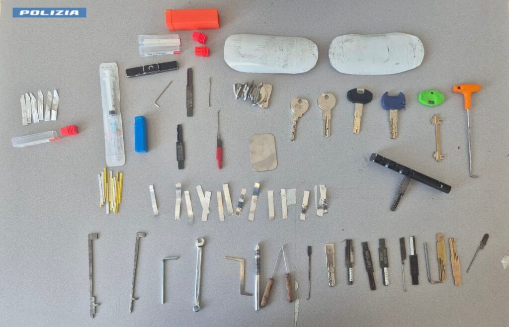 Un “laboratorio portatile” concepito per operare su più tipologie di serrature. Gli accertamenti successivi hanno confermato il suo profilo seriale: plurimi alias e diverse condanne pregresse per reati predatori su tutto il territorio nazionale. Il Giudice ha disposto nei suoi confronti la custodia cautelare in carcere.