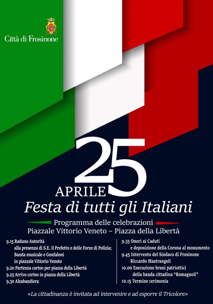 Il 25 aprile non è soltanto una data sul calendario: è la festa della Repubblica, della democrazia e della libertà riconquistata. L’Amministrazione Comunale di Frosinone invita l’intera cittadinanza a prendere parte alle celebrazioni e, nel frattempo, a esporre il tricolore dai balconi e dalle finestre delle proprie abitazioni. Un gesto semplice, ma dal valore simbolico che non passa mai di moda.
