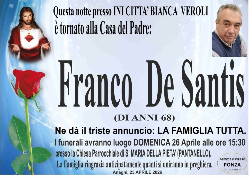 Anagni si è svegliata oggi con una notizia che ha velato di tristezza questa splendida giornata di primavera. Nella notte tra il 24 e il 25 aprile 2026, si è spento all’età di 68 anni Franco De Santis, una figura che per decenni è stata un punto di riferimento silenzioso ma costante per chiunque avesse bisogno di cure e conforto. Il decesso è avvenuto in una struttura sanitaria di Veroli.