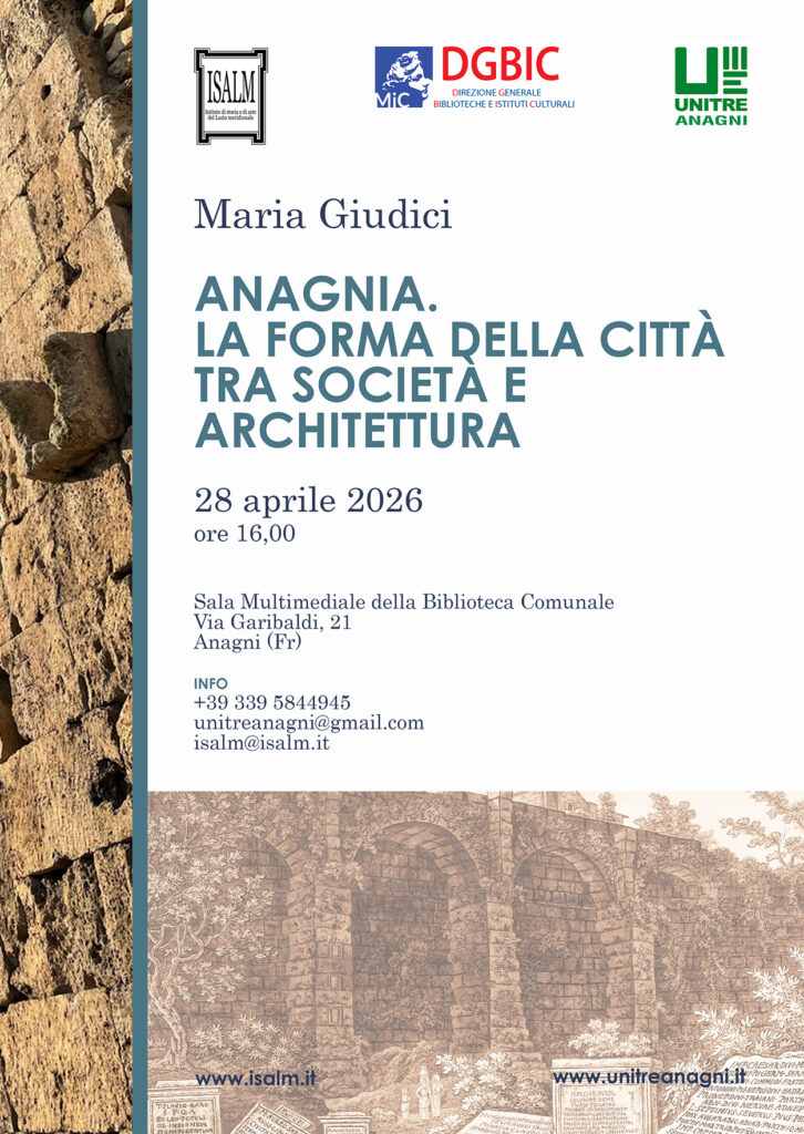 Martedì 28 aprile 2026, alle ore 16.00, la sala multimediale della Biblioteca Comunale – in via Garibaldi, 21 – ospiterà la seconda giornata del ciclo, curata da Maria Giudici che proporrà un’analisi su tema “Anagni. La forma della città tra società e architettura”.