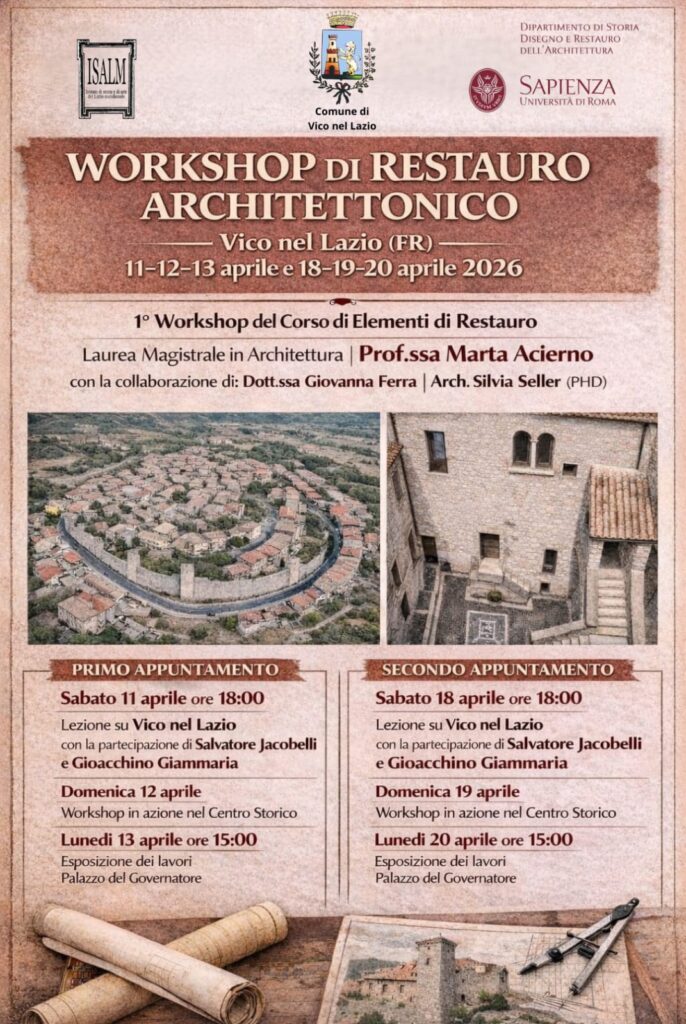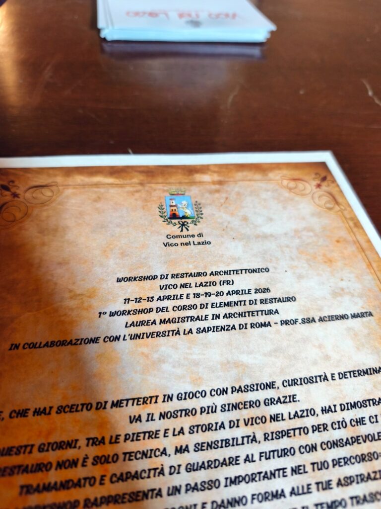 Il fascino immutato del medioevo che incontra il rigore della scienza accademica tra i vicoli di pietra di uno dei borghi più suggestivi della Ciociaria. Si è concluso con un bilancio estremamente positivo, nel weekend del 18 e 19 aprile, il primo workshop di restauro architettonico che ha trasformato il centro storico di Vico nel Lazio in un vero e proprio laboratorio didattico a cielo aperto. L’iniziativa, nata dalla stretta collaborazione con il Dipartimento di Storia Disegno e Restauro dell’Architettura dell’Università La Sapienza di Roma, ha segnato un punto di svolta nel rapporto tra tutela del patrimonio e formazione sul campo.