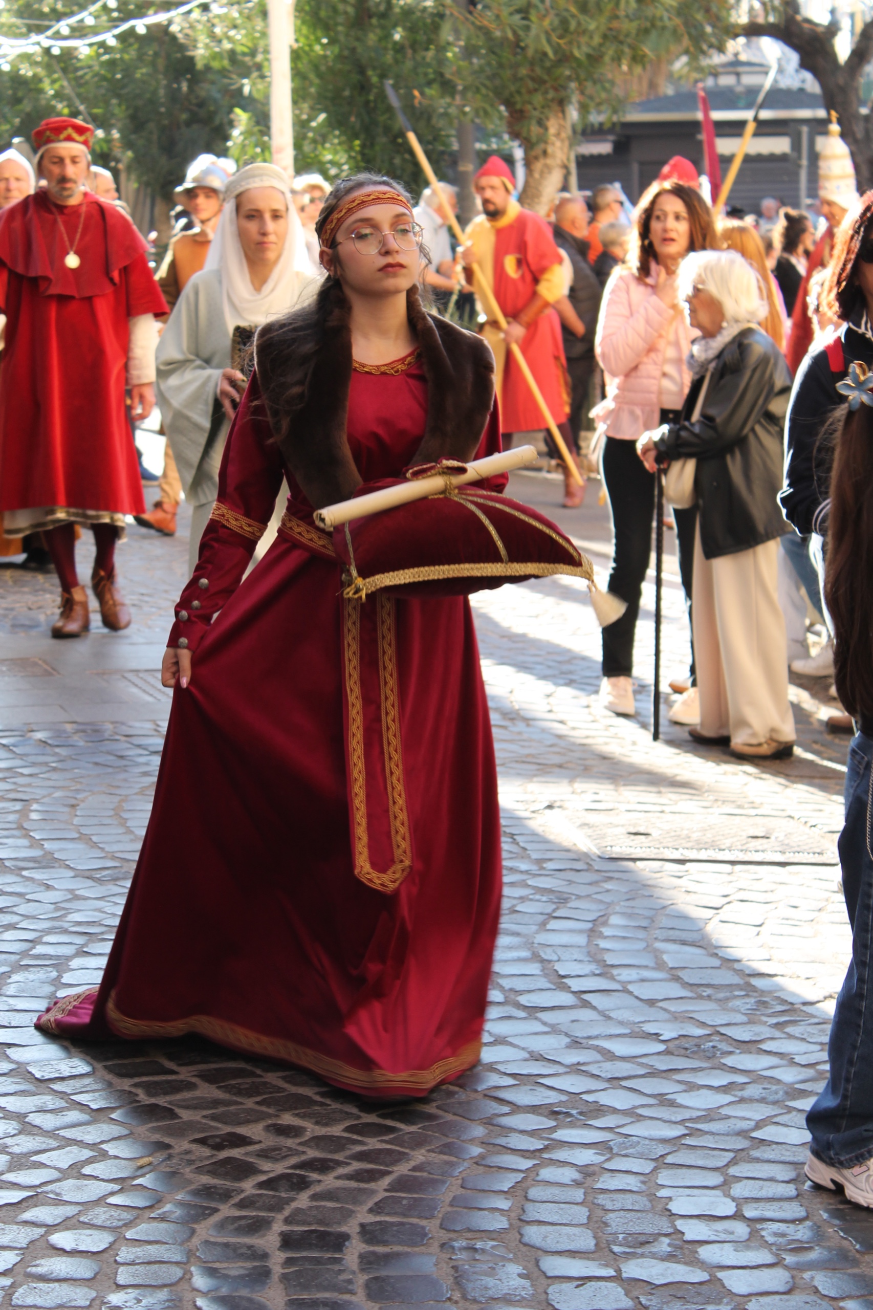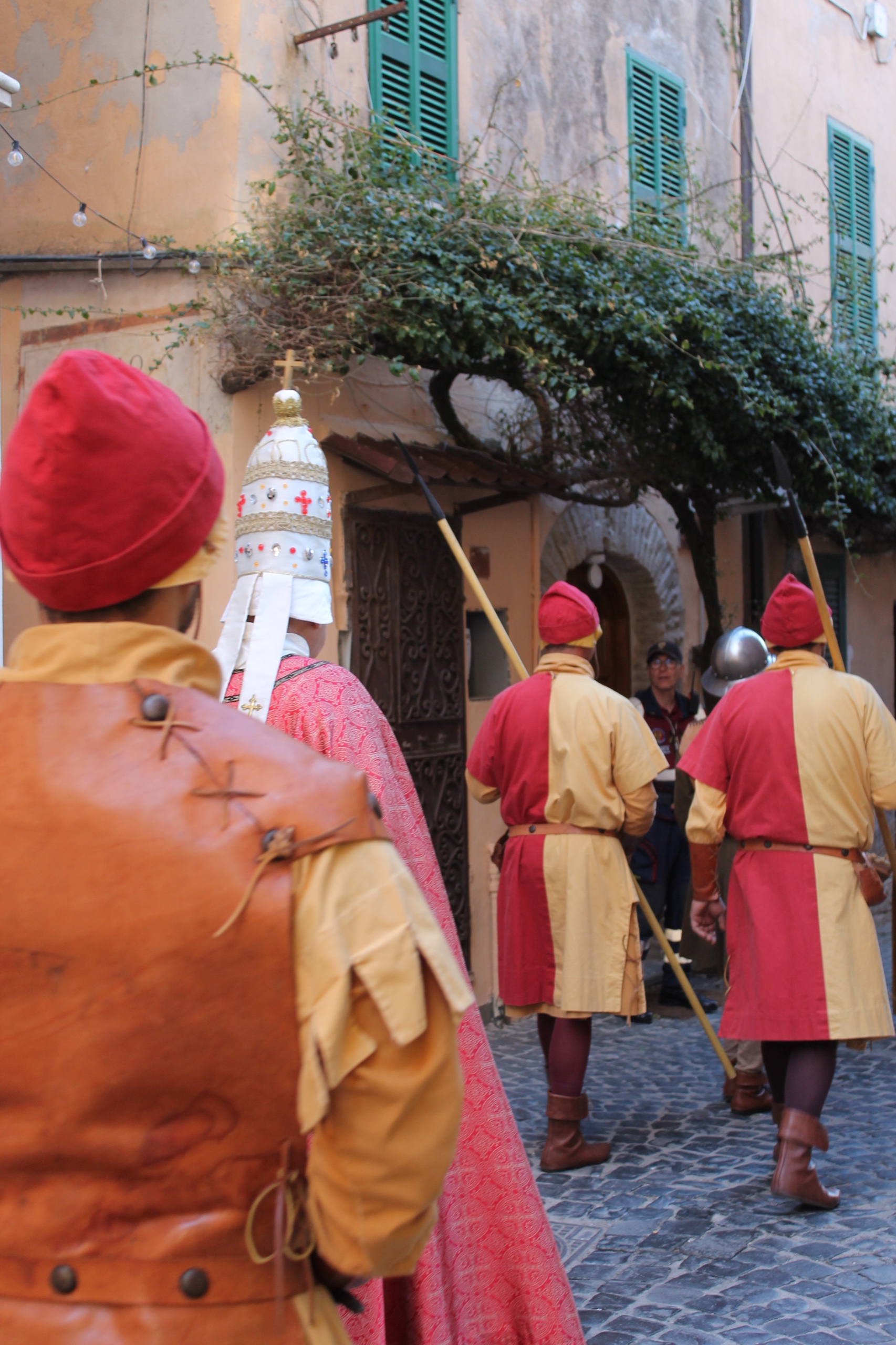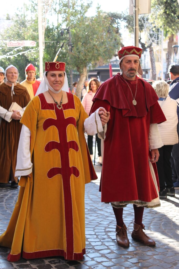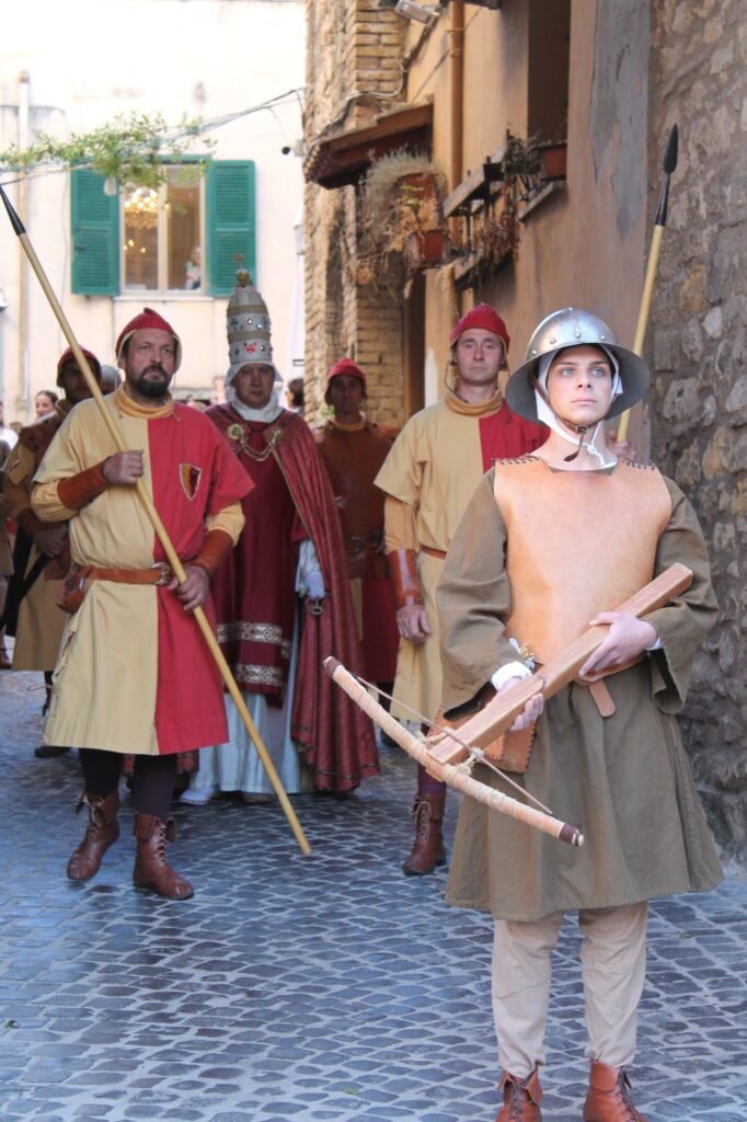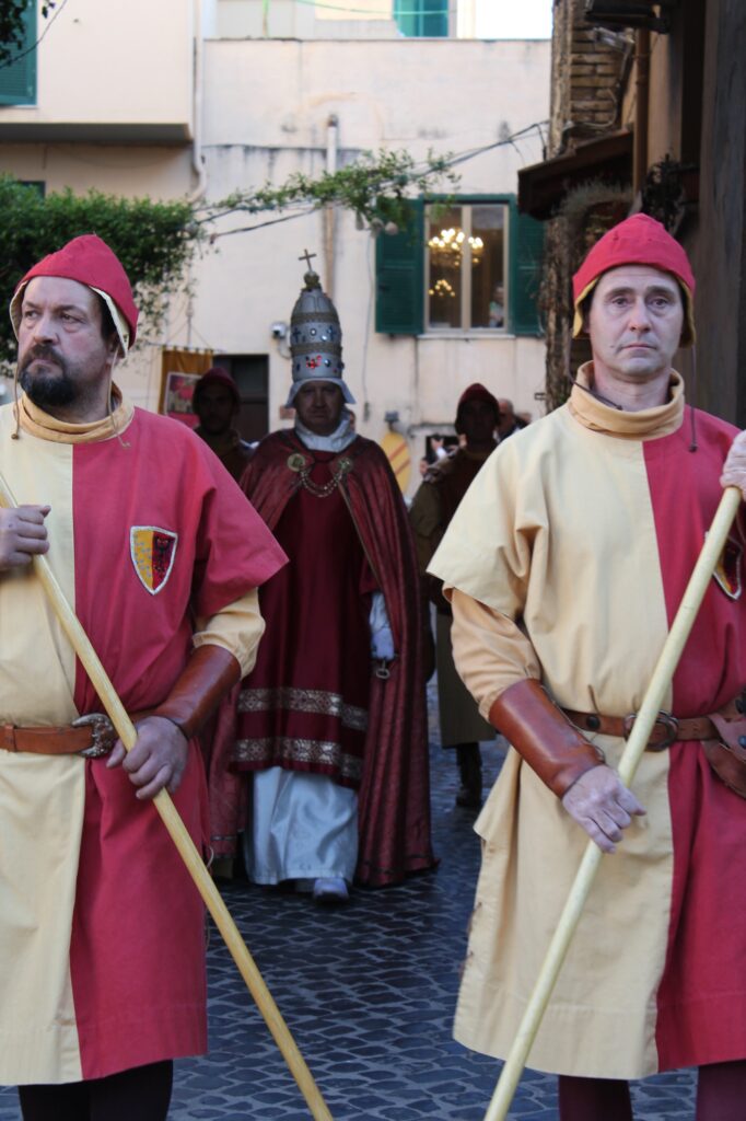 Al centro della scena, come da tradizione, la figura di Bonifacio VIII, il pontefice che più di ogni altro ha segnato la storia medievale di Anagni e che resta il simbolo più riconoscibile del corteo cittadino. Accompagnato dalle sue guardie e da un gruppo di templari, il corteo ha offerto ai presenti uno spaccato autentico e suggestivo della vita anagnina di quell’epoca, restituendo al pubblico l’atmosfera di una città che nel Medioevo era crocevia di potere, fede e politica europea.