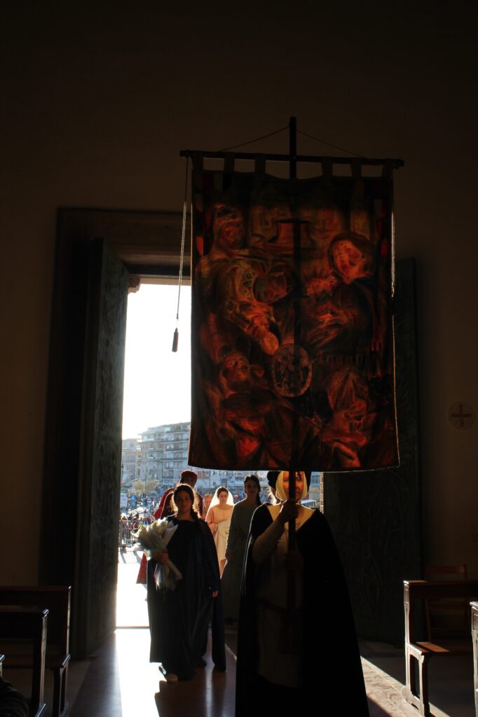 Il lungo corteo si è concluso presso il Santuario della Nostra Signora delle Grazie e di Santa Maria Goretti, luogo di grande devozione per la comunità di Nettuno. Qui, dopo i saluti istituzionali dei sacerdoti e del sindaco Nicola Burrini, le delegazioni presenti hanno reso omaggio alla Madonna in un clima di raccoglimento e partecipazione sincera, un momento in cui la dimensione storica e quella spirituale si sono fuse con naturalezza, nonostante l’imponente presenza dei figuranti provenienti da tutta la regione.