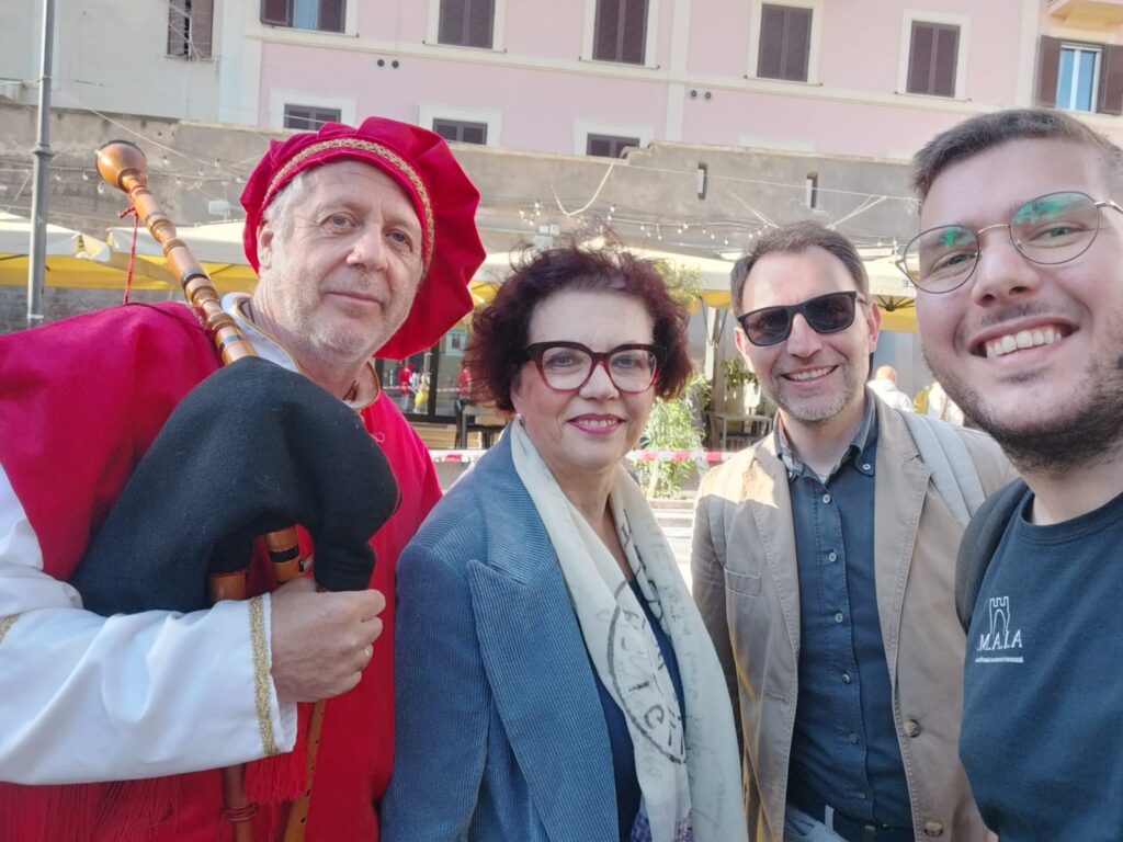 Alla trasferta erano presenti anche alcuni capicontrada anagnini, insieme al Vicepresidente Carlo Cerasaro e al Professor Lorenzo Proscio, figure sempre più attive nel panorama associativo regionale e in particolare all’interno della Federazione Regionale Manifestazioni Storiche del Lazio, organismo che raccoglie e coordina le principali realtà storiche della regione.