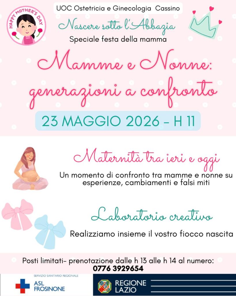 Sempre a Cassino, sabato 23 maggio, è in programma “Mamme e nonne: generazioni a confronto”, un doppio momento di riflessione e creatività. Da una parte il confronto tra esperienze di maternità di ieri e di oggi, tra cambiamenti culturali e falsi miti; dall’altra un laboratorio dedicato alla realizzazione del “gioco nascita”, simbolo di continuità e affetto tra generazioni.