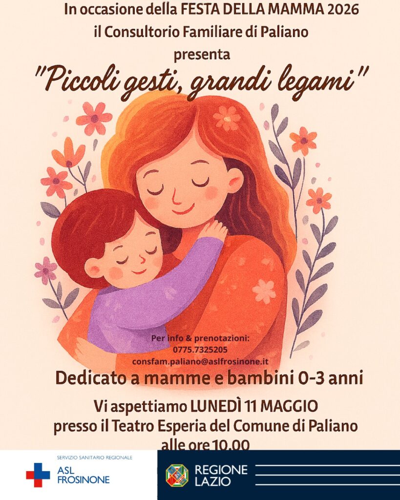 A Paliano, invece, lunedì 11 maggio, il Teatro “Esperia” ospita l’iniziativa “Piccoli gesti, grandi legami”, organizzata dal Consultorio familiare e rivolta alle mamme e ai bambini da 0 a 3 anni. L’incontro punta a rafforzare il legame affettivo attraverso momenti di confronto e attività dedicate alla prima infanzia.