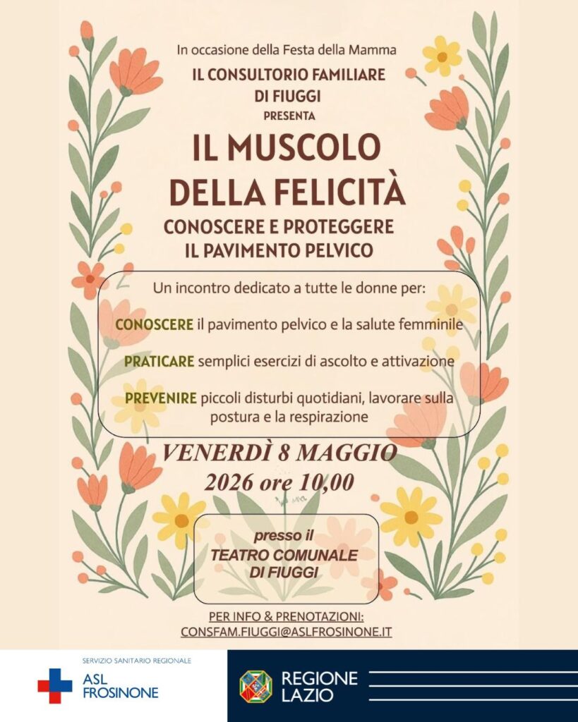 Sempre l’8 maggio, a Fiuggi, il Consultorio familiare propone al Teatro comunale l’incontro “Il muscolo della felicità. Conoscere e proteggere il pavimento pelvico”, dedicato alla prevenzione e alla consapevolezza del corpo femminile. Un appuntamento che unisce informazione e pratica, con esercizi e spiegazioni pensate per accompagnare le donne nella cura di sé.