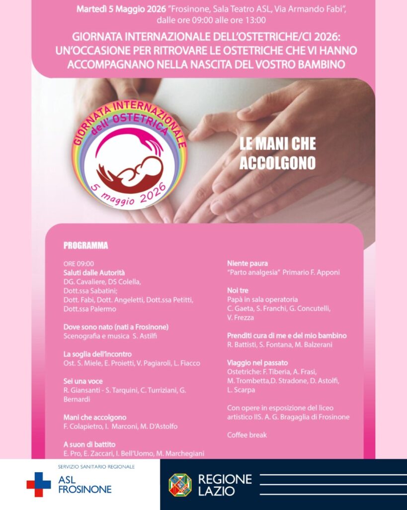 Il primo appuntamento è in programma martedì 5 maggio a Frosinone, nella Sala Teatro di via Armando Fabi. Qui, dalle ore 9.00, si svolgerà la giornata dal titolo “Mani che accolgono”, un momento di incontro che mette al centro il lavoro delle ostetriche e degli ostetrici attraverso interventi di professionisti sanitari, testimonianze e racconti di esperienze vissute.