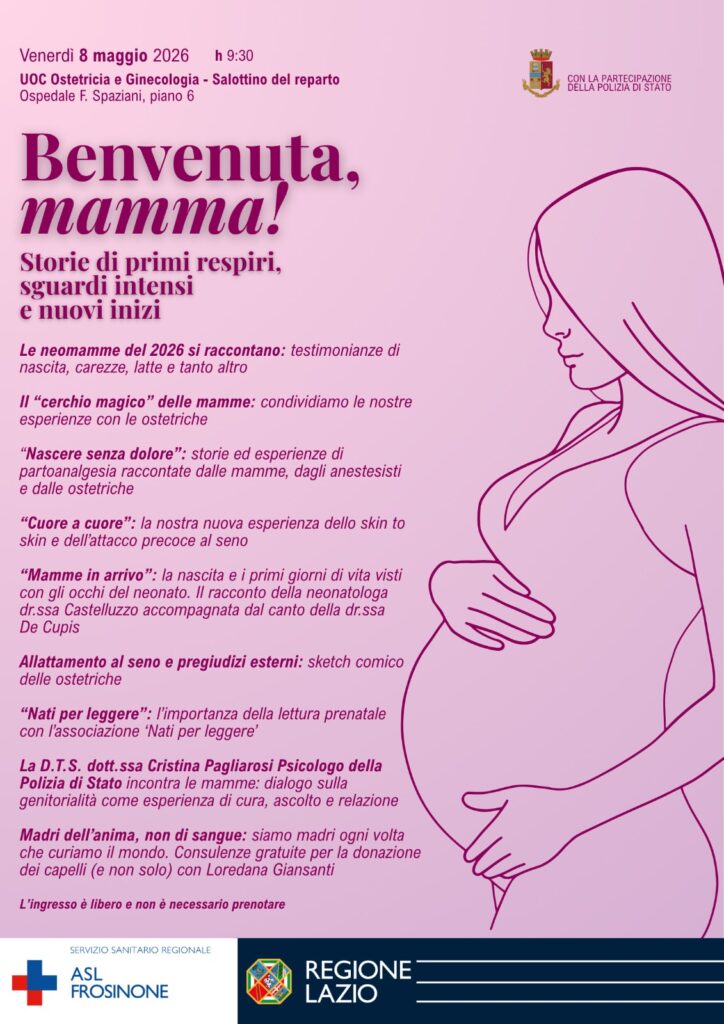 Il percorso prosegue venerdì 8 maggio all’interno dell’Ospedale “Fabrizio Spaziani” di Frosinone, al sesto piano del reparto di Ostetricia e Ginecologia. L’iniziativa, dal titolo “Benvenuta, mamma! Storie di primi respiri, sguardi intensi e nuovi inizi”, si rivolge alle donne che sono già madri o che si preparano a diventarlo.