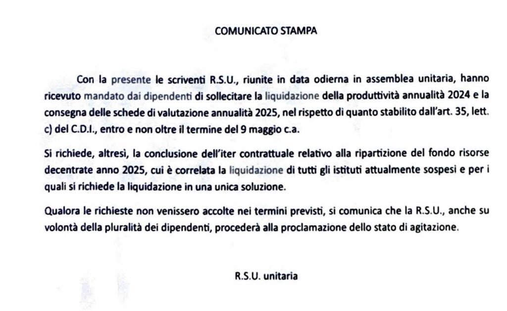 Con un comunicato stampa inviato ad anagnia.com nel pomeiggio di ieri 28 aprile 2026, le R.S.U. unitarie hanno formalizzato una richiesta chiara e perentoria: rispettare le scadenze relative alla liquidazione della produttività annualità 2024 e alla consegna delle schede di valutazione annualità 2025. Il documento nasce da un’assemblea unitaria tenutasi nella giornata odierna, durante la quale i rappresentanti sindacali hanno ricevuto un mandato diretto dai lavoratori.